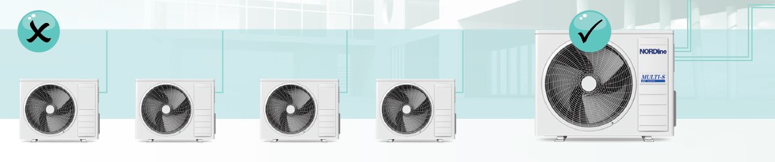Venkovní jednotky NORDline multisplit jsou vysoce výkonné a přitom velmi málo hlučné. DC invertor zajišťuje vysokou efektivitu kompresoru a díky ekologickému chladivu R32 nedochází k zatížení životního prostředí.