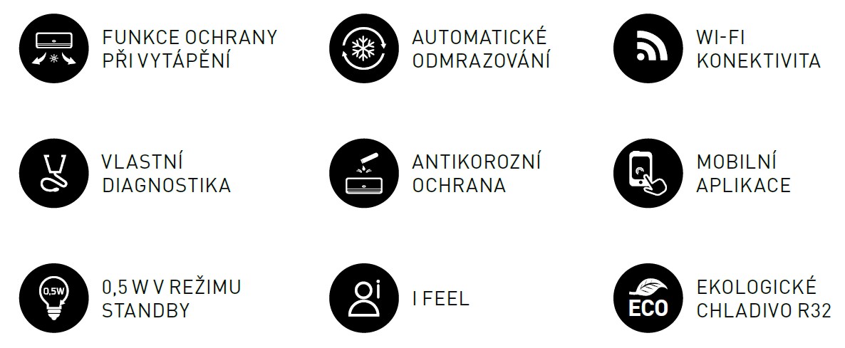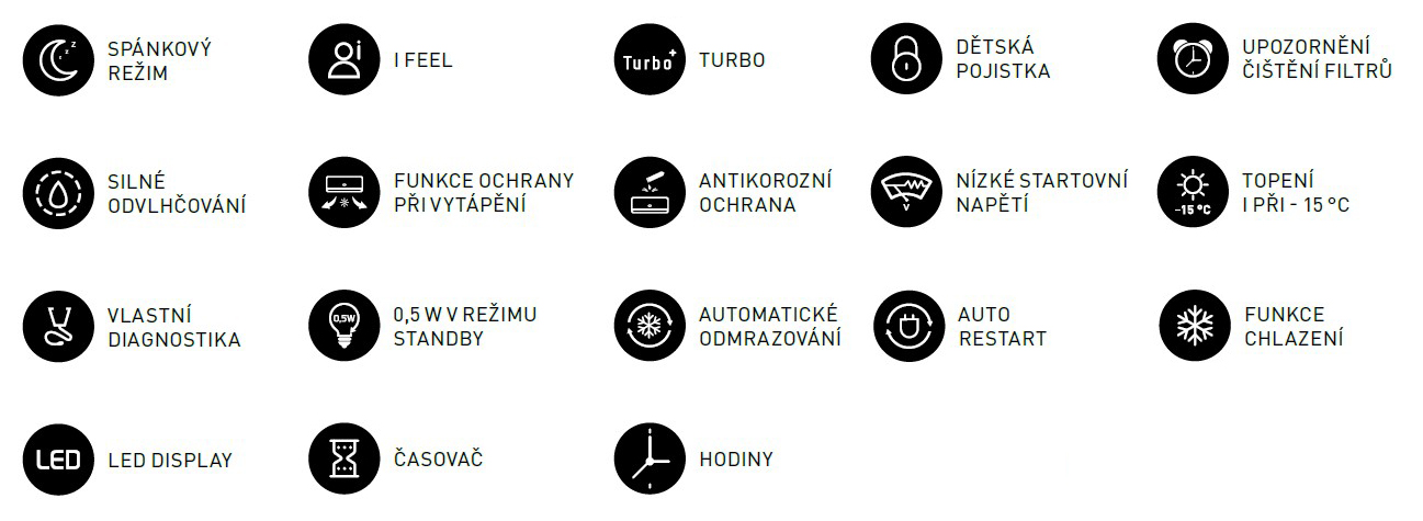 Funkce odpovídají nejmodernějším standardům a díky dálkovému ovladači má zákazník vše hezky na dosah ruky. Nechybí samozřejmě ani funkce, jako jsou automatické odmrazování, restart nebo ochrana při vytápění. LED display, časovač i vlastní diagnostika klimatizace je taktéž součástí zařízení.