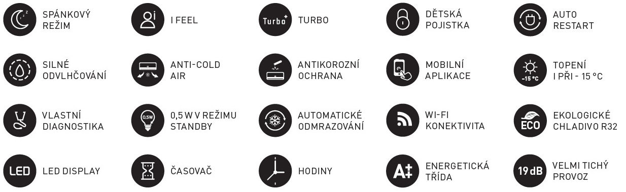 - Ovládání přes mobilní aplikaci. Po připojení zařízení do domácí sítě Wi-Fi, možnost ovládat klimatizaci odkudkoliv s připojením k internetu.